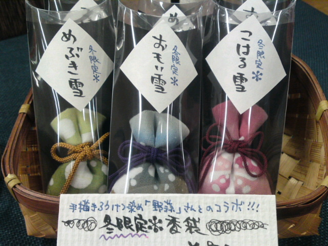 今回の惑木犀の新商品は手描きろうけつ染めの野蒜さんとのコラボ香袋!