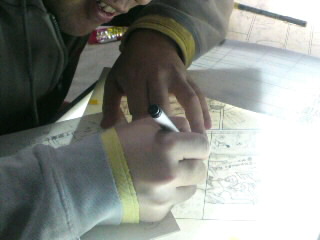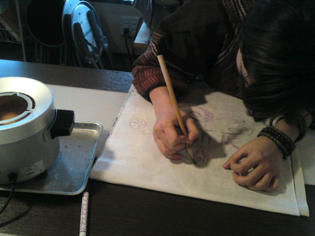 先ずは下書きを生地に写して、それを筆を使ってロウを塗り込んでいきます。