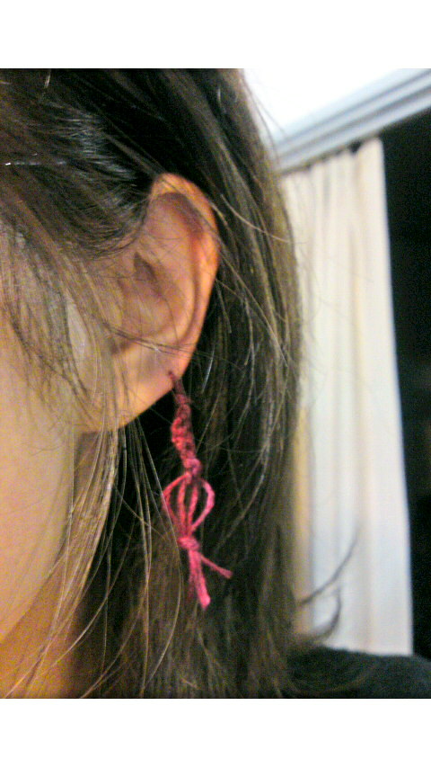耳に直接糸を通してミサンガを編むというなんと斬新でシンプルな案