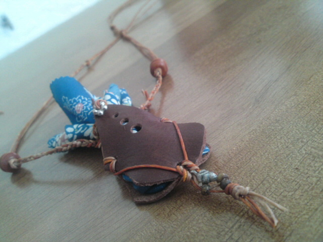 次に革の形を自分で切って、パンチで穴をあけたとこに紐やビーズで結んだり編んだりするだけ!