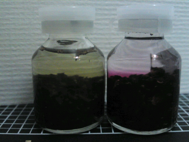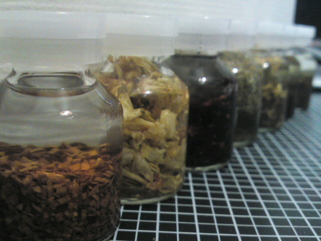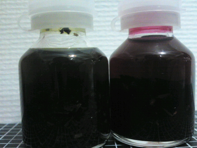 ハイビスカスは朝焼けみたいな色からドピンク一色になりましたがあんまり…あんまり香りがでてないような?バラのオイルの話は有名ですが、やっぱ花びら系は大量に浸けないとだめかもですね
